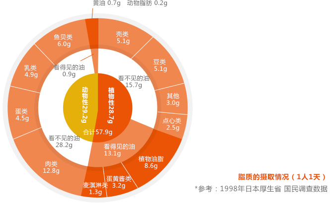 雖然都稱作脂肪,但是脂肪是可來源于動物性脂肪、植物油和魚類。從日本人的營養(yǎng)攝取狀況來看,動物、植物、魚類攝取的脂肪比例以4:5:1為理想目標(biāo)。